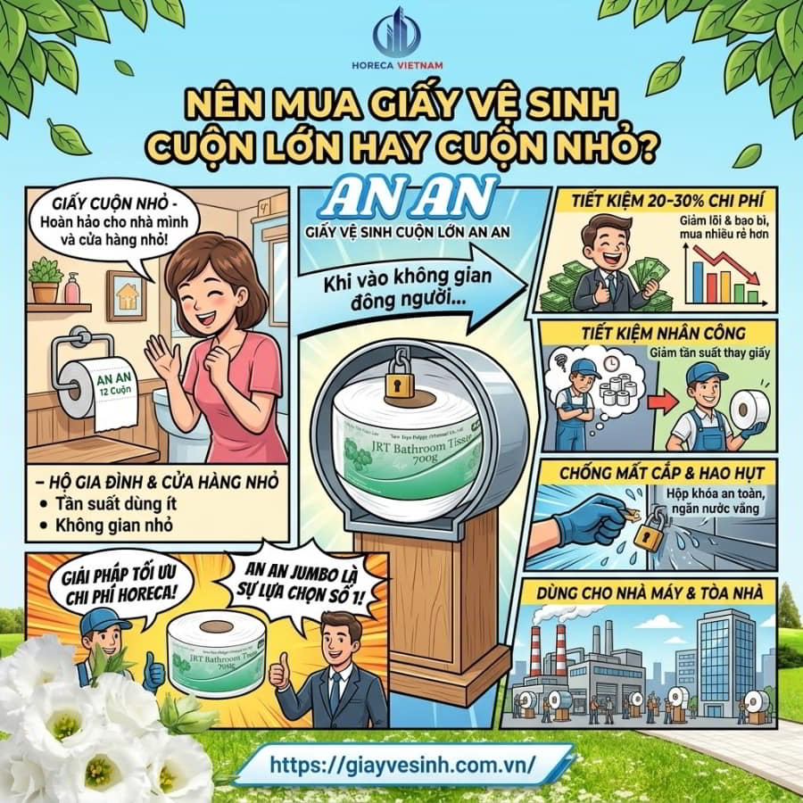 - Tiết kiệm nhân công: Nhân viên tạp vụ không phải đi thay giấy liên tục nhiều lần trong ngày. Đó là lý do các loại giấy cuộn lớn, điển hình như dòng giấy vệ sinh cuộn lớn An Khang hoặc An An Jumbo, đang là sự thay thế hoàn hảo để tối ưu chi phí, đặc biệt là giấy vệ sinh cho nhà máy hay giấy vệ sinh cuộn lớn cho tòa nhà văn phòng.