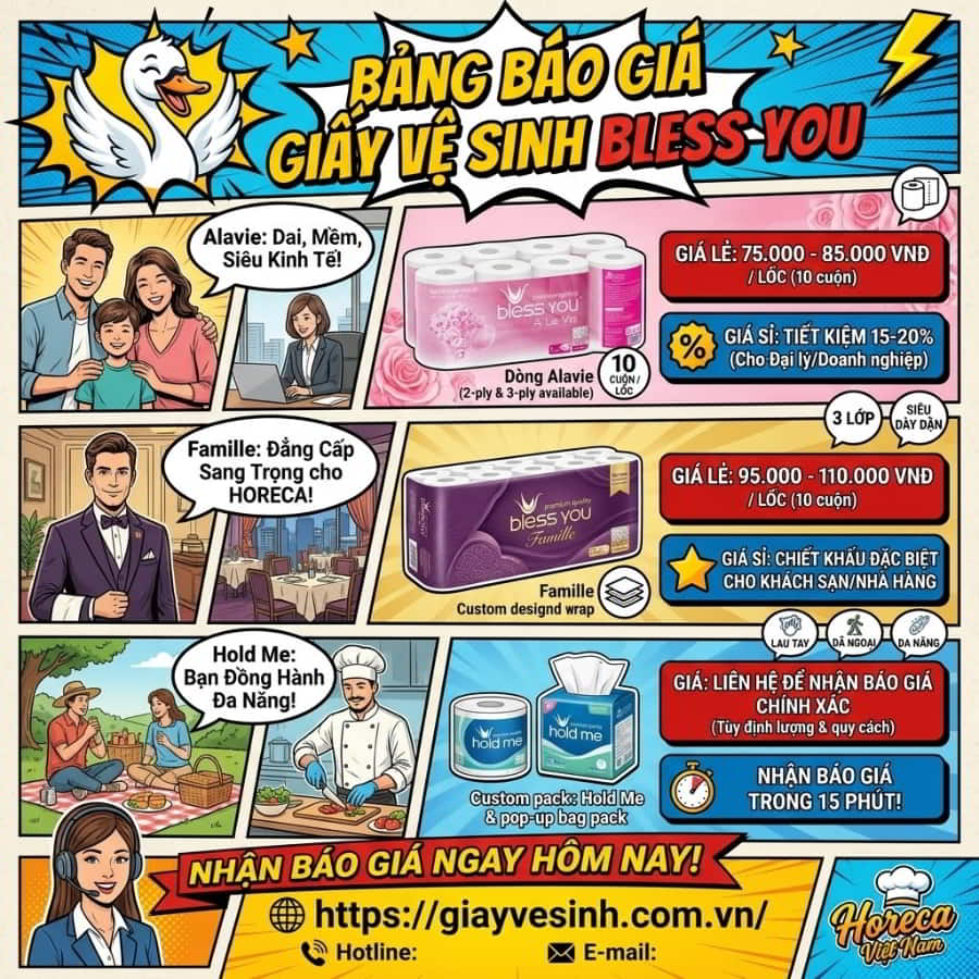 HÀNH ĐỘNG NGAY: Đừng để lợi nhuận của doanh nghiệp thất thoát qua những cuộn giấy kém chất lượng và giá cao. Hãy gọi ngay cho hotline của Horeca Việt Nam ngay hôm nay để nhận báo giá giấy vệ sinh Bless You chi tiết nhất cùng chương trình chiết khấu khủng trong tháng này!