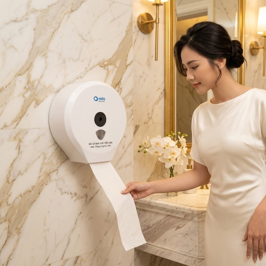 Trong ngành dịch vụ lưu trú như khách sạn và khu resort, trải nghiệm của khách hàng luôn được đặt lên hàng đầu, nhưng đồng thời việc kiểm soát chi phí vận hành cũng mang tính sống còn. Các không gian này thường có lưu lượng khách hàng rất cao. Việc sử dụng các loại giấy cuộn nhỏ truyền thống mang lại vô số bất cập: nhân viên buồng phòng phải liên tục túc trực để kiểm tra và thay giấy, lõi giấy bị vứt bỏ bừa bãi gây rác thải, và tình trạng hết giấy giữa chừng thường xuyên xảy ra gây khó chịu cho du khách.