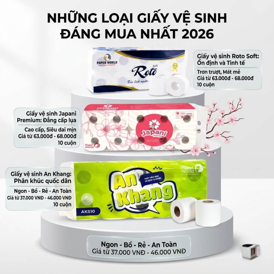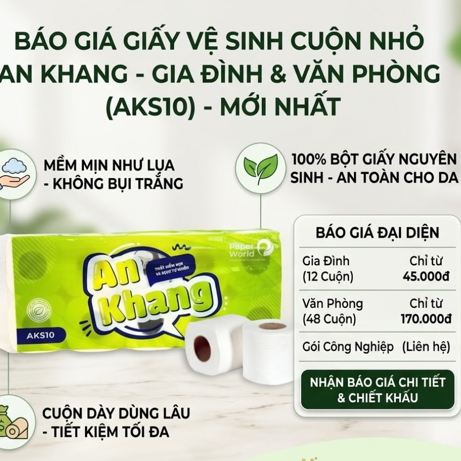 - Giấy vệ sinh cuộn nhỏ An Khang Soft (Phân khúc Tầm trung): ~46.000 VNĐ/lốc.