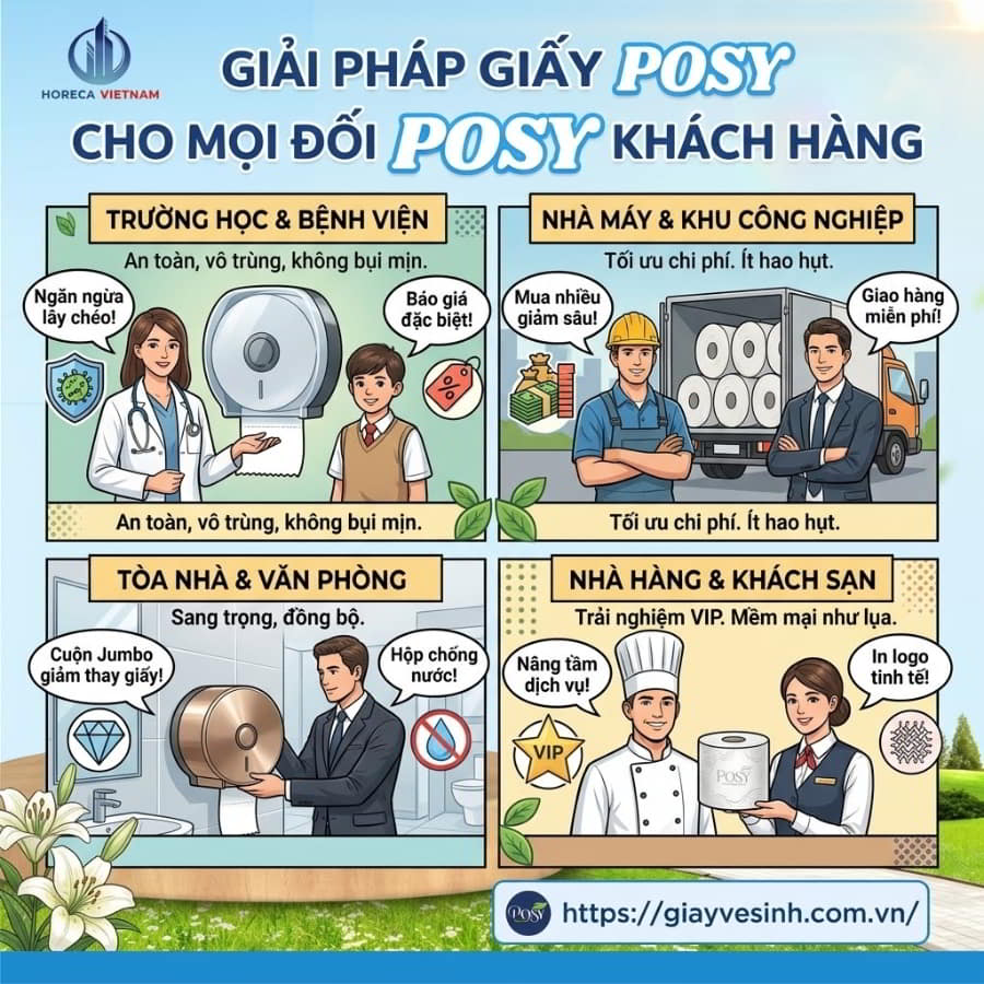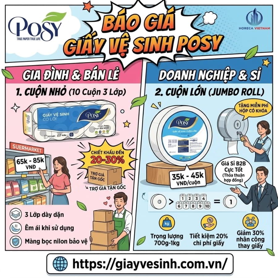 Bạn đã sẵn sàng cắt giảm lãng phí và nâng tầm chất lượng vệ sinh cho không gian của mình? Đừng để những báo giá mập mờ làm mất thời gian của bạn. Hãy liên hệ ngay với Horeca Việt Nam qua Hotline hoặc truy cập giayvesinh.com.vn để nhận ngay Bảng báo giá giấy vệ sinh Posy sỉ/lẻ chiết khấu cao nhất hôm nay! Dịch vụ tận tâm – Chất lượng xứng tầm.