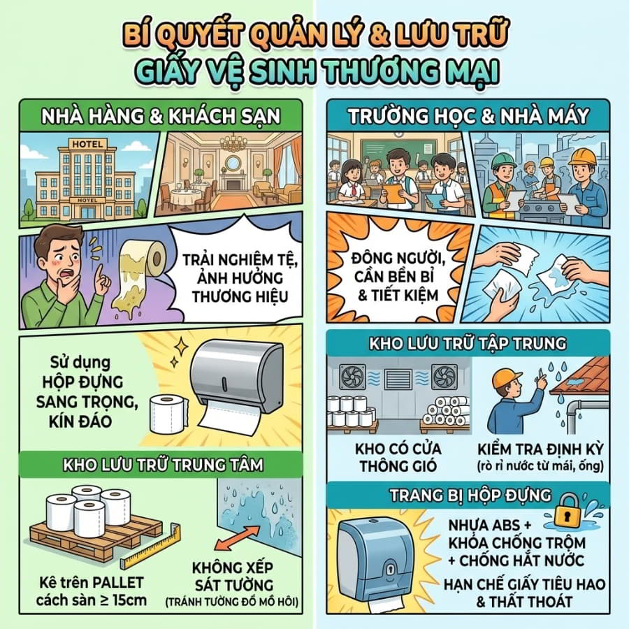 Tại các không gian sang trọng, trải nghiệm của khách lưu trú là sinh mệnh của thương hiệu. Khách hàng sẽ đánh giá ngay chất lượng dịch vụ nếu bắt gặp cuộn giấy ố vàng hay nhũn nước. Các loại giấy vệ sinh cho khách sạn và giấy vệ sinh cho nhà hàng bắt buộc phải được đặt trong các thiết bị hộp đựng sang trọng, thiết kế kín đáo. Ở khu vực kho lưu trữ trung tâm, giấy lốc sỉ phải được kê trên pallet cách mặt sàn ít nhất 15cm, không xếp sát tường để tránh hiện tượng tường đổ mồ hôi truyền ẩm sang bao bì nilon bên ngoài.