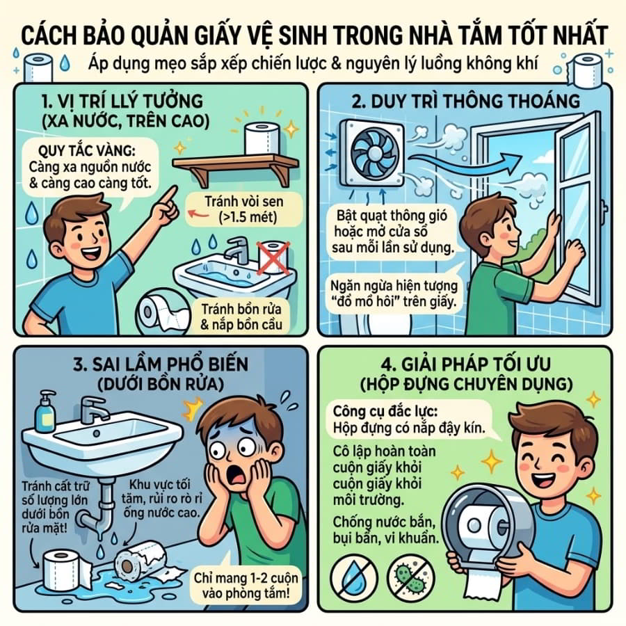 Quy tắc vàng trong việc cất giữ giấy vệ sinh là: Càng xa nguồn nước và càng cao càng tốt. Tuyệt đối không đặt giấy trực tiếp trên mặt kính bồn rửa mặt hoặc nắp bồn cầu – nơi nước dễ dàng văng trúng. Các kệ treo tường ở khu vực thông thoáng, đối diện hoặc cách xa vòi sen tối thiểu 1.5 mét là lựa chọn lý tưởng. Ngoài ra, hãy duy trì sự thông thoáng cho phòng tắm bằng cách mở cửa sổ hoặc bật quạt thông gió sau mỗi lần sử dụng. Điều này giúp đẩy luồng không khí ẩm ra ngoài, ngăn ngừa hiện tượng “đổ mồ hôi” trên bề mặt giấy.
