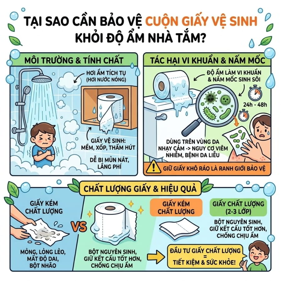 Hãy thử tưởng tượng: Bước vào một phòng tắm sang trọng, sạch sẽ nhưng khi đưa tay rút giấy, bạn lại chạm phải một cuộn giấy mềm nhũn, lạnh lẽo, bốc mùi ẩm mốc khó chịu. Trải nghiệm tồi tệ này không chỉ đánh sập hoàn toàn cảm giác thư giãn của bạn mà còn là hồi chuông cảnh báo về hàng ngàn ổ vi khuẩn vô hình đang chực chờ gây hại cho làn da nhạy cảm. Nhà tắm – với đặc thù kín, độ ẩm cao và sự thay đổi nhiệt độ liên tục – chính là “thiên địch” của giấy vệ sinh. Đừng để sự vô ý biến vật dụng thiết yếu hàng ngày thành mầm mống gây bệnh. Bài viết này sẽ cung cấp cho bạn những giải pháp tối ưu nhất để bảo quản giấy vệ sinh trong nhà tắm luôn khô ráo, sạch sẽ, bảo vệ sức khỏe và tiết kiệm tối đa chi phí.