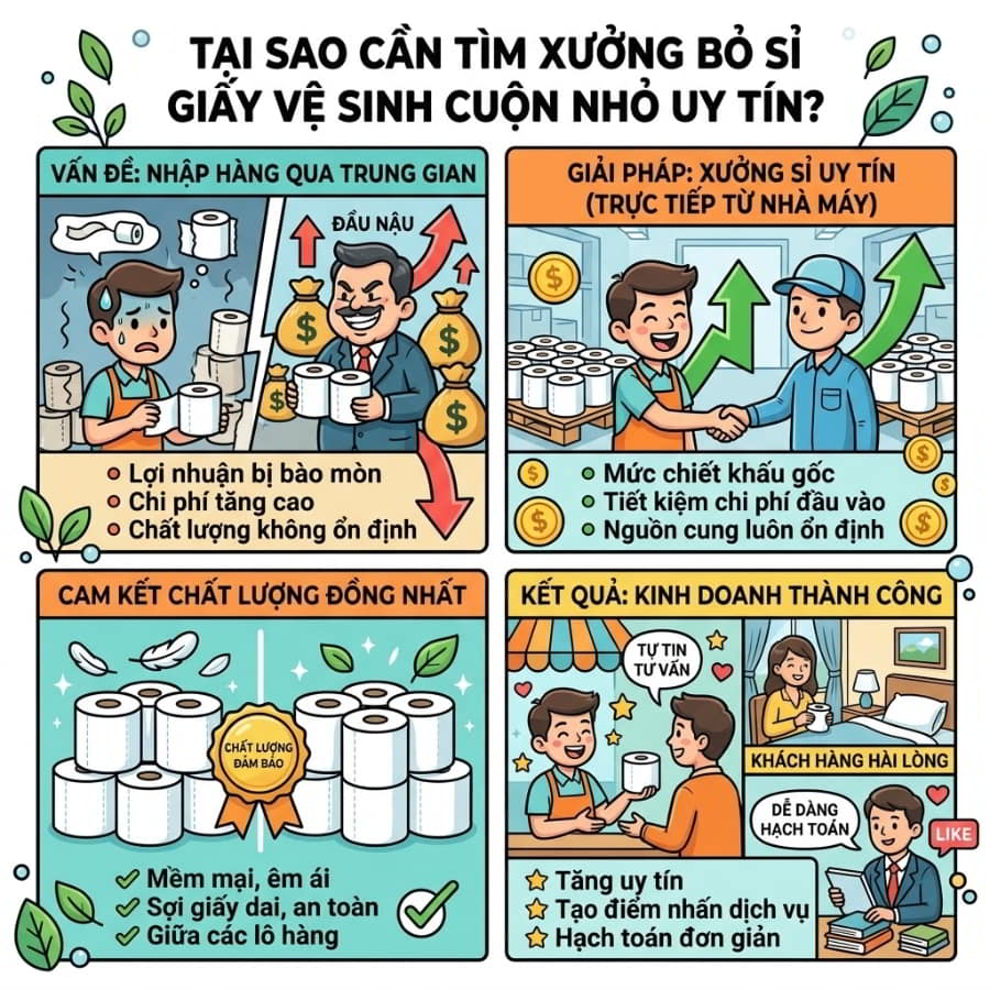 Bạn có bao giờ tự hỏi tại sao khách hàng mua giấy vệ sinh ở tiệm tạp hóa của bạn một lần rồi không bao giờ quay lại? Hoặc tại sao chi phí vật tư tiêu hao tại khách sạn, nhà hàng của bạn luôn vượt ngân sách dù đã cố gắng mua loại rẻ nhất? Sự thật là, cuộc chiến bán lẻ và kinh doanh dịch vụ không nằm ở việc ai tìm được hàng rẻ hơn, mà nằm ở việc ai tìm được nguồn bỏ sỉ giấy vệ sinh cuộn nhỏ mang lại tỷ suất lợi nhuận cao nhưng vẫn giữ chân được khách hàng bằng chất lượng.