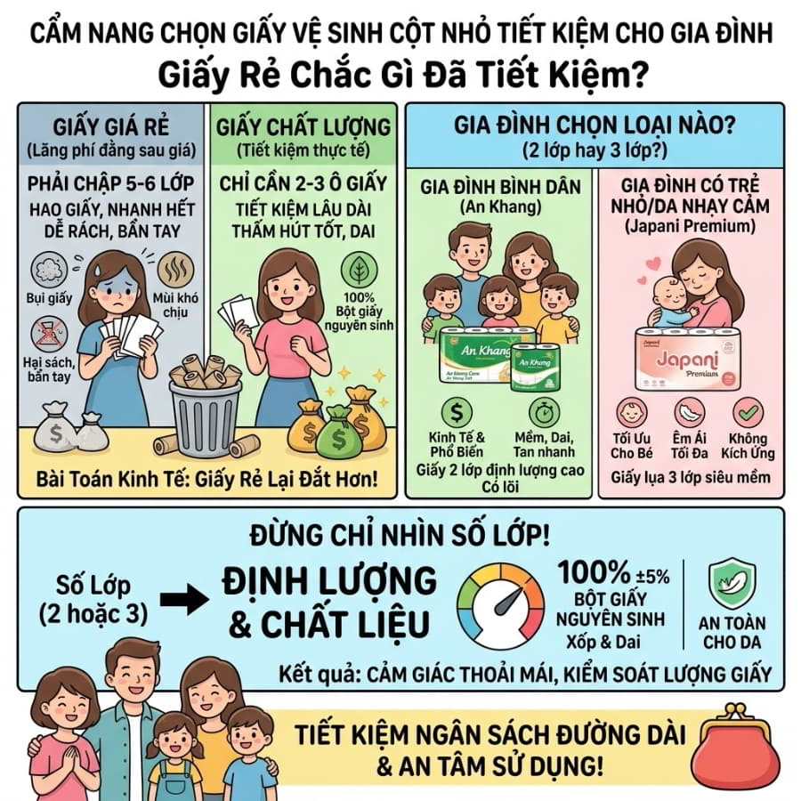 Gia đình là môi trường sử dụng lý tưởng nhất cho giấy vệ sinh cuộn thường nhờ số lượng người dùng ổn định, dễ kiểm soát lượng giấy tiêu thụ và ưu tiên cảm giác mềm mại, an toàn cho da. Khi cân nhắc giữa giấy 2 lớp và 3 lớp, gia đình nên chọn giấy 2–3 lớp làm từ bột giấy nguyên sinh, mềm, dai, tan nhanh trong nước. Đối với các gia đình bình dân, giấy vệ sinh cuộn nhỏ An Khang (An Khang Caro, An Khang Soft) mang thông điệp “tiết kiệm cho người sử dụng”, thường có lõi, 2 lớp là lựa chọn kinh tế và phổ biến. Tuy nhiên, nếu gia đình bạn có trẻ nhỏ hoặc da nhạy cảm, dòng giấy lụa 3 lớp siêu mềm như Japani Premium lại tối ưu hơn vì trải nghiệm êm ái tối đa, không gây kích ứng. Dù là 2 lớp định lượng cao hay 3 lớp xốp nhẹ, điểm mấu chốt là số lớp chỉ là một phần, định lượng và chất liệu mới là yếu tố quyết định.