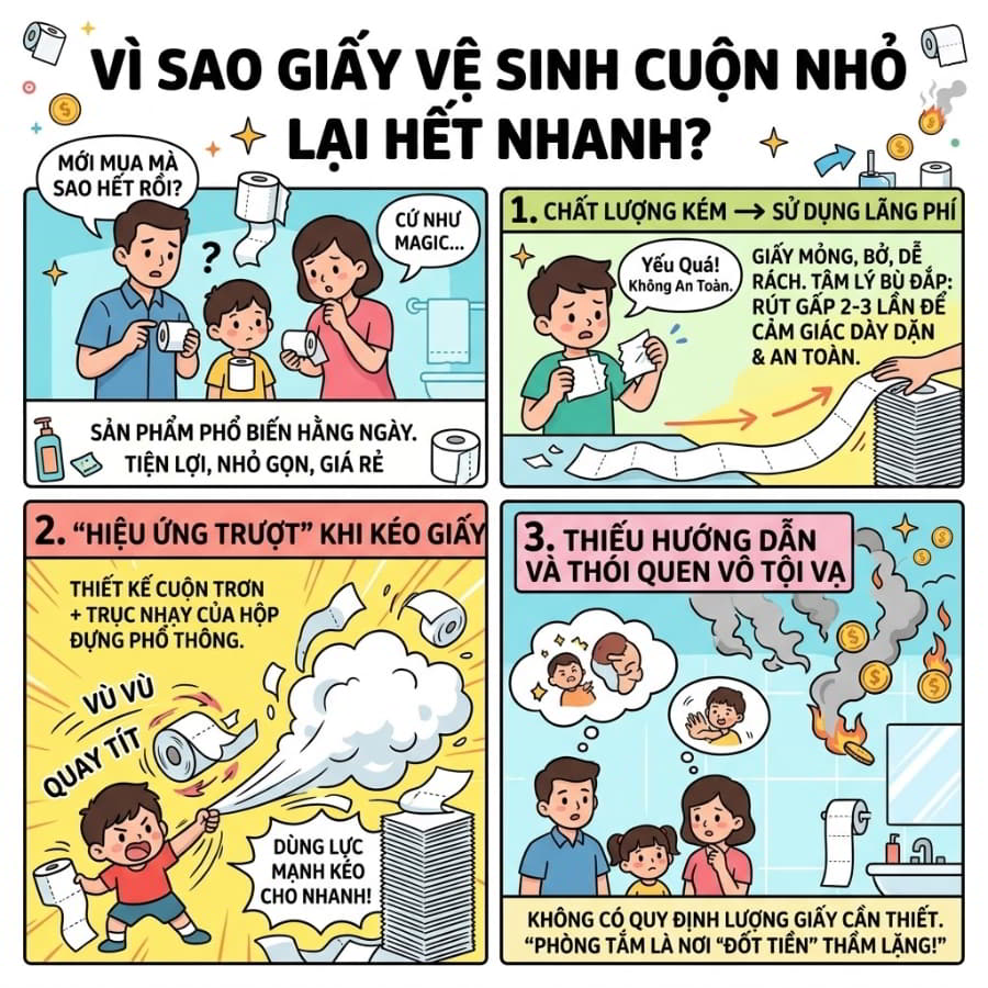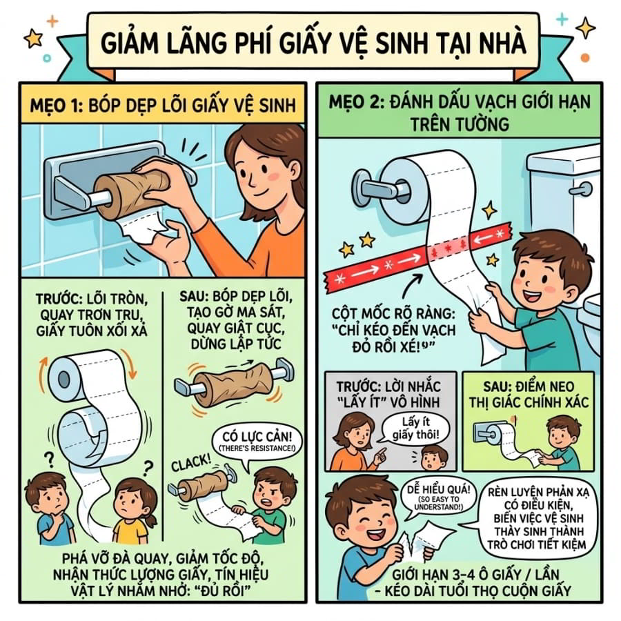 Có bao giờ bạn vừa gắn một cuộn giấy vệ sinh mới vào phòng tắm buổi sáng, nhưng đến chiều tối đã thấy lõi giấy trống trơn? Đối với nhiều gia đình, đặc biệt là những nhà có trẻ em, chi phí dành cho nhu yếu phẩm này đang âm thầm “ngốn” một khoản tiền không nhỏ mỗi tháng. Nỗi đau lớn nhất không phải là việc mua giấy, mà là cảm giác bực bội khi chứng kiến những dải giấy trắng tinh bị kéo vô tội vạ, cuộn tròn rồi ném đi một cách lãng phí.