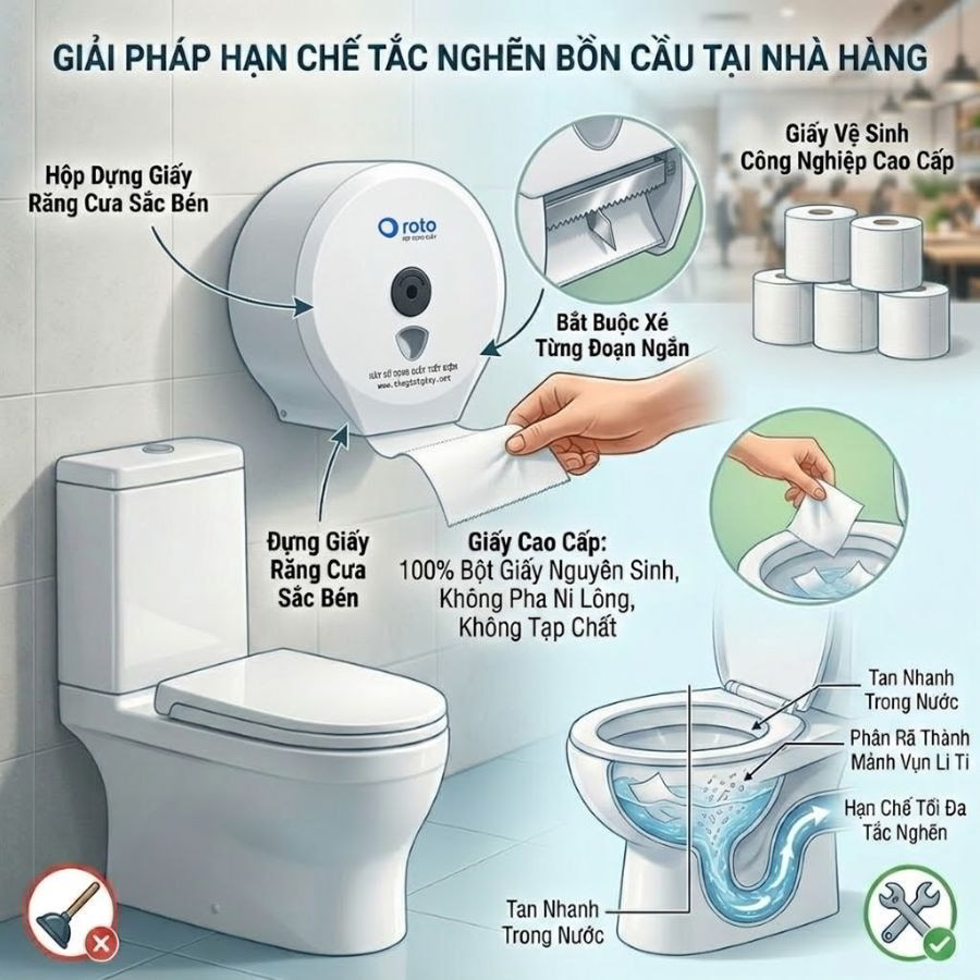 Tắc nghẽn bồn cầu là cơn ác mộng tồi tệ nhất của mọi nhà hàng. Thử tưởng tượng vào tối thứ Bảy đông khách, một phòng vệ sinh bị nghẹt nước tràn ra sàn, mùi xú uế bốc lên… Thiệt hại không chỉ dừng lại ở tờ hóa đơn hàng triệu đồng gọi thợ thông cống khẩn cấp, mà nó còn phá hủy hoàn toàn danh tiếng và trải nghiệm bữa ăn của khách hàng. Thủ phạm chính của 90% các vụ tắc nghẽn này chính là giấy vệ sinh kém chất lượng pha lẫn ni lông, tạp chất, hoặc khách hàng sử dụng quá nhiều giấy cuộn nhỏ cùng một lúc.