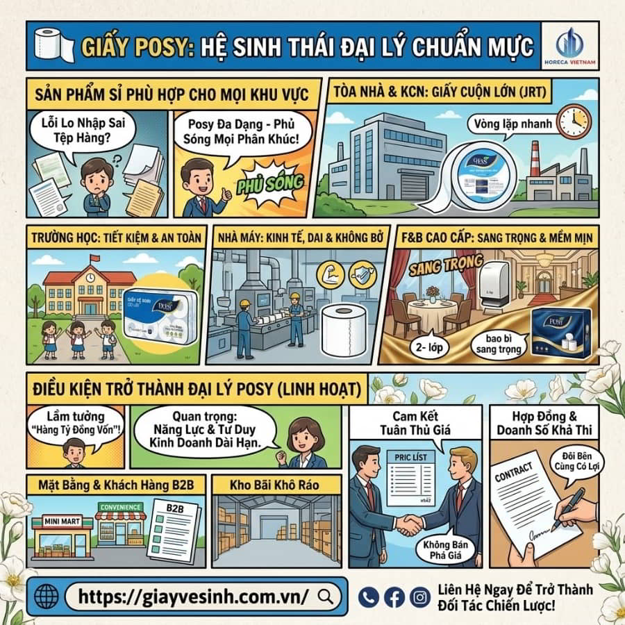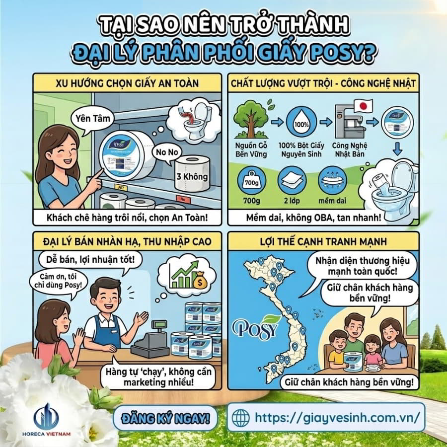 Đừng để cơ hội kinh doanh siêu lợi nhuận rơi vào tay đối thủ! Ngay hôm nay, hãy nắm bắt cơ hội trở thành đối tác chiến lược của thương hiệu giấy vệ sinh hàng đầu. Liên hệ ngay với Horeca Việt Nam qua số Hotline trên website giayvesinh.com.vn để nhận ngay bảng báo giá sỉ và chính sách đại lý giấy Posy mới nhất. Chúc bạn bứt phá doanh thu thành công!