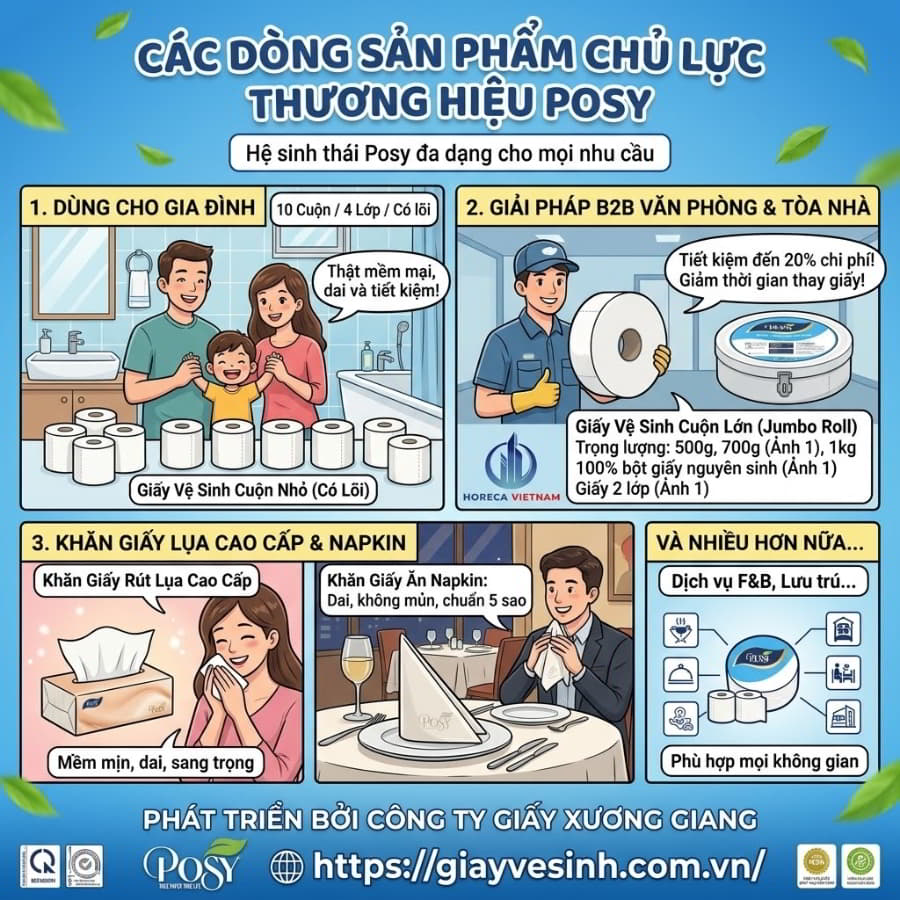 Công ty giấy Xương Giang đã phát triển một hệ sinh thái sản phẩm Posy vô cùng đa dạng để len lỏi vào mọi ngóc ngách của đời sống. Bao gồm: Giấy vệ sinh cuộn nhỏ (có lõi và không lõi) dùng cho gia đình; Khăn giấy rút lụa cao cấp; Khăn giấy ăn Napkin; và đặc biệt là dòng sản phẩm chiến lược dành cho kênh B2B: Giấy vệ sinh cuộn lớn (Jumbo Roll). Dòng cuộn lớn với định lượng đa dạng từ 500g, 700g đến 1kg là giải pháp tối ưu giúp giảm thiểu thời gian thay giấy và tiết kiệm đến 20% chi phí vật tư cho các tổ chức.