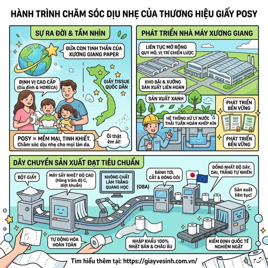 Để tạo ra những cuộn giấy Posy thượng hạng, Công ty giấy Xương Giang đã không ngần ngại nhập khẩu 100% dây chuyền sản xuất tiên tiến từ Nhật Bản và Châu Âu. Hệ thống máy móc tự động hóa hoàn toàn từ khâu đánh tơi bột giấy, sấy khô nhiệt độ cao (lên tới hàng trăm độ C giúp diệt khuẩn tuyệt đối), đến khâu cắt và đóng gói. Dây chuyền này đáp ứng nghiêm ngặt các tiêu chuẩn kiểm định quốc tế, nói không với chất làm trắng quang học (OBA). Nhờ đó, mỗi mét giấy xuất xưởng đều đồng nhất về độ dày, độ dai và độ trắng tự nhiên.