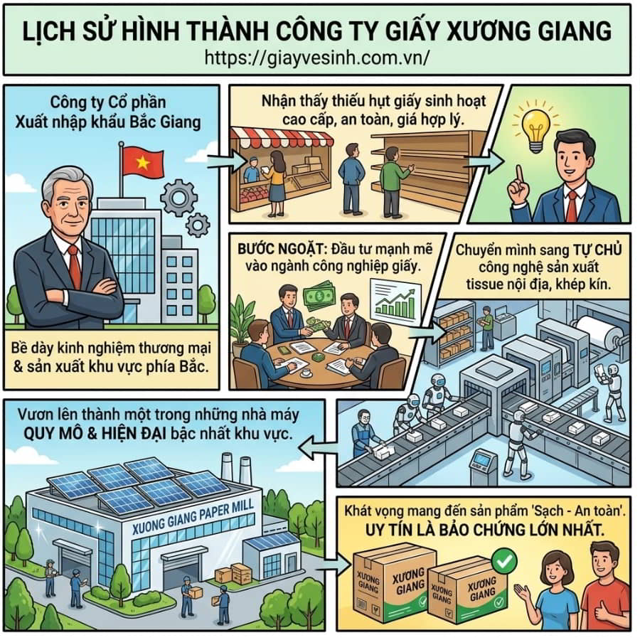 Công ty Cổ phần Xuất nhập khẩu Bắc Giang, đơn vị chủ quản của nhà máy giấy Xương Giang, vốn là một tên tuổi có bề dày kinh nghiệm trong lĩnh vực thương mại và sản xuất tại khu vực phía Bắc. Nhận thấy thị trường nội địa đang thiếu hụt trầm trọng những dòng giấy sinh hoạt cao cấp, an toàn cho sức khỏe với mức giá hợp lý, ban lãnh đạo công ty đã quyết định đầu tư mạnh mẽ vào ngành công nghiệp giấy.
