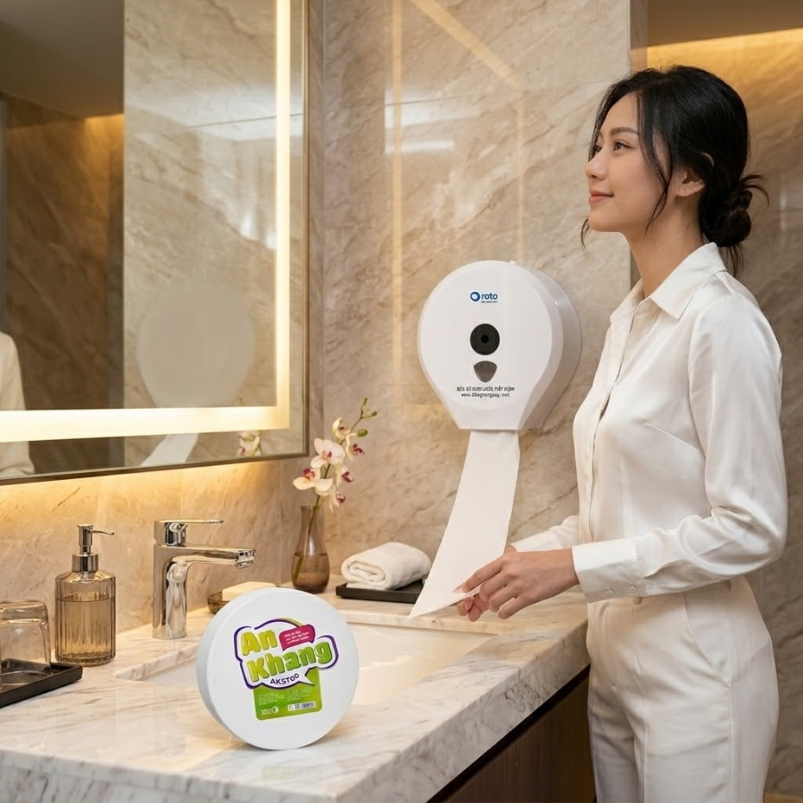 Bằng việc yêu cầu đối tác cung cấp giấy vệ sinh cho tòa nhà đưa vào dòng cuộn lớn 700g (dòng quốc dân phổ biến nhất), mọi rắc rối được giải quyết triệt để. Một cuộn 700g có thể phục vụ từ 3 đến 5 ngày cho một buồng vệ sinh có lưu lượng sử dụng cao. Nhân viên tạp vụ giờ đây được giải phóng khỏi vòng lặp kiểm tra vô nghĩa, giảm đến 80% thời gian thay thế. Họ có thể tập trung vào các công đoạn làm sạch sâu, lau chùi kính, khử khuẩn bề mặt – những yếu tố thực sự tạo nên đẳng cấp của không gian vệ sinh.
