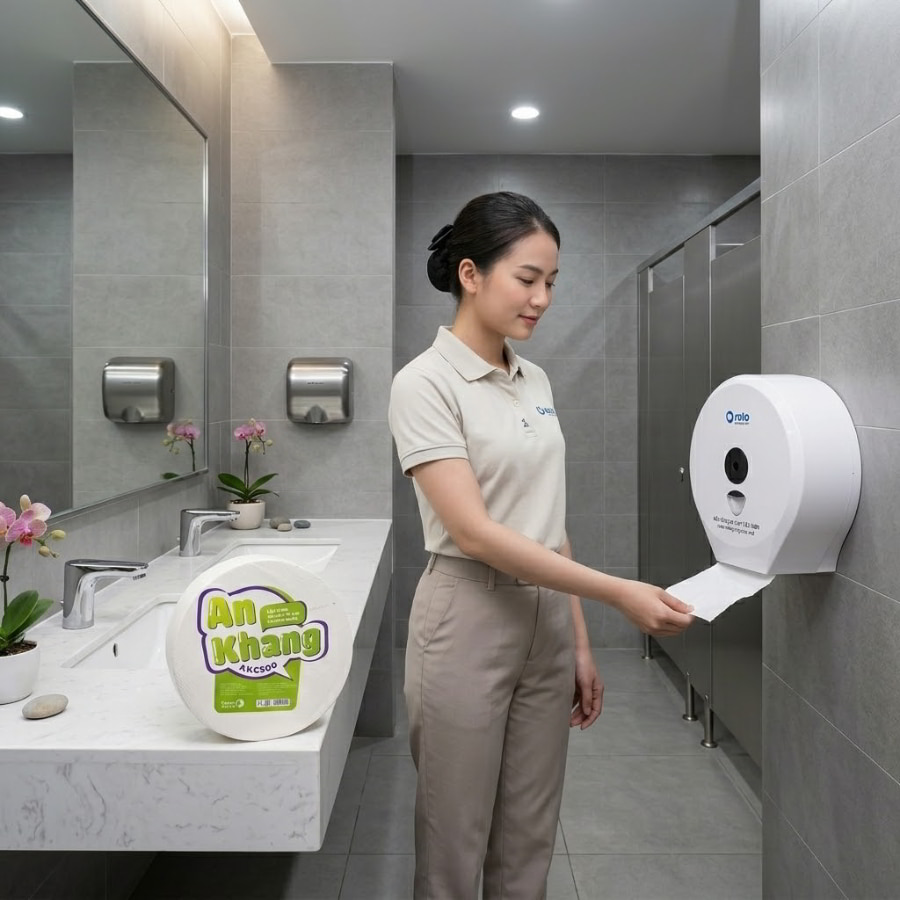 - Cắt giảm triệt để chi phí nhân công: Nhân viên tạp vụ không còn phải đi tuần tra và thay giấy mỗi giờ. Cuộn Jumbo 900g có thể dùng liên tục 3-5 ngày trong môi trường đông đúc. Thời gian dôi dư được nhân sự tập trung làm sạch sâu khu vực vệ sinh, giúp nâng cao năng suất lao động tổng thể.