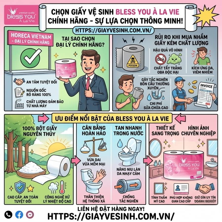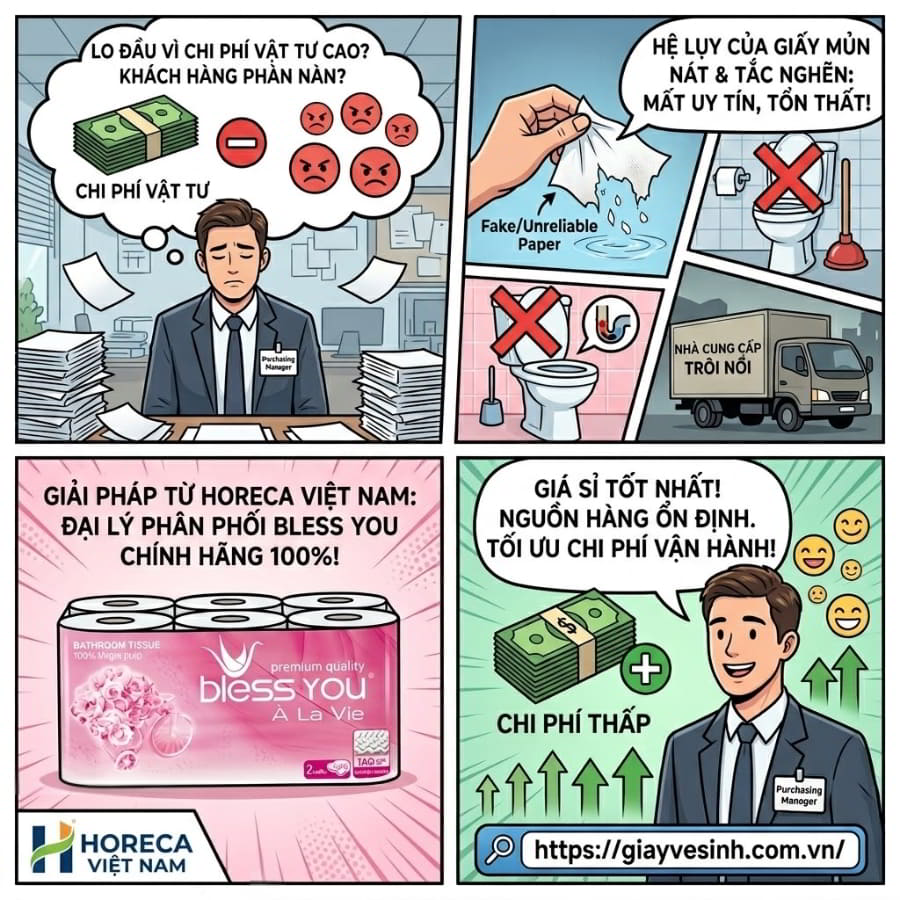 Đừng để việc mua sắm vật tư tiêu hao trở thành gánh nặng cho doanh nghiệp của bạn! Hãy để Horeca Việt Nam đồng hành cùng bạn. Liên hệ ngay với chúng tôi hôm nay qua Website Giayvesinh.com.vn để nhận báo giá sỉ đại lý giấy vệ sinh Bless You tốt nhất thị trường cùng chương trình tặng hộp đựng giấy miễn phí độc quyền!