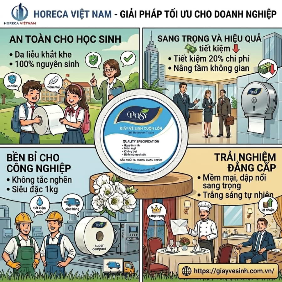 Horeca Việt Nam tự hào là đối tác chiến lược hàng đầu phân phối các dòng sản phẩm Posy. Chúng tôi không chỉ bán giấy, chúng tôi cung cấp giải pháp. Đối với môi trường đông đúc, tần suất sử dụng cao, Horeca VN tư vấn sử dụng các dòng giấy vệ sinh cuộn lớn giúp giảm thiểu thời gian thay giấy của nhân viên tạp vụ, chống mất cắp và tối ưu không gian.