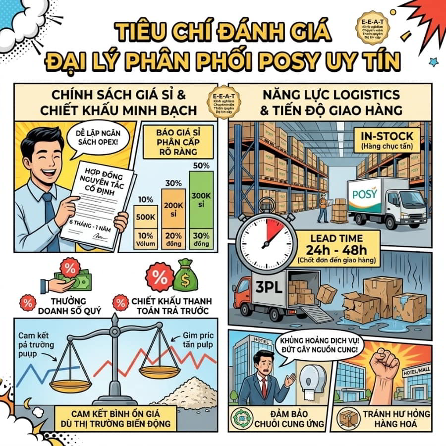 Với những tiêu chí đánh giá chuyên sâu ở trên, hy vọng việc lựa chọn đại lý giấy vệ sinh Posy chính hãng sẽ trở nên dễ dàng và chuẩn xác hơn, giúp doanh nghiệp tối ưu triệt để chi phí vận hành, ngăn chặn rủi ro hàng nhái và đảm bảo chuỗi cung ứng vật tư luôn hoạt động ổn định.