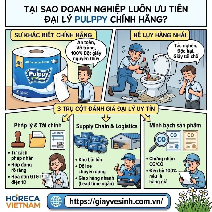 Việc gõ từ khóa “đại lý giấy vệ sinh pulppy” trên Google sẽ trả về hàng trăm kết quả, nhưng để chọn ra một đối tác B2B (Doanh nghiệp với Doanh nghiệp) đi đường dài, bạn cần một bộ lọc khắt khe hơn. Đừng chỉ nhìn vào mức giá rẻ giật mình trên mạng.
