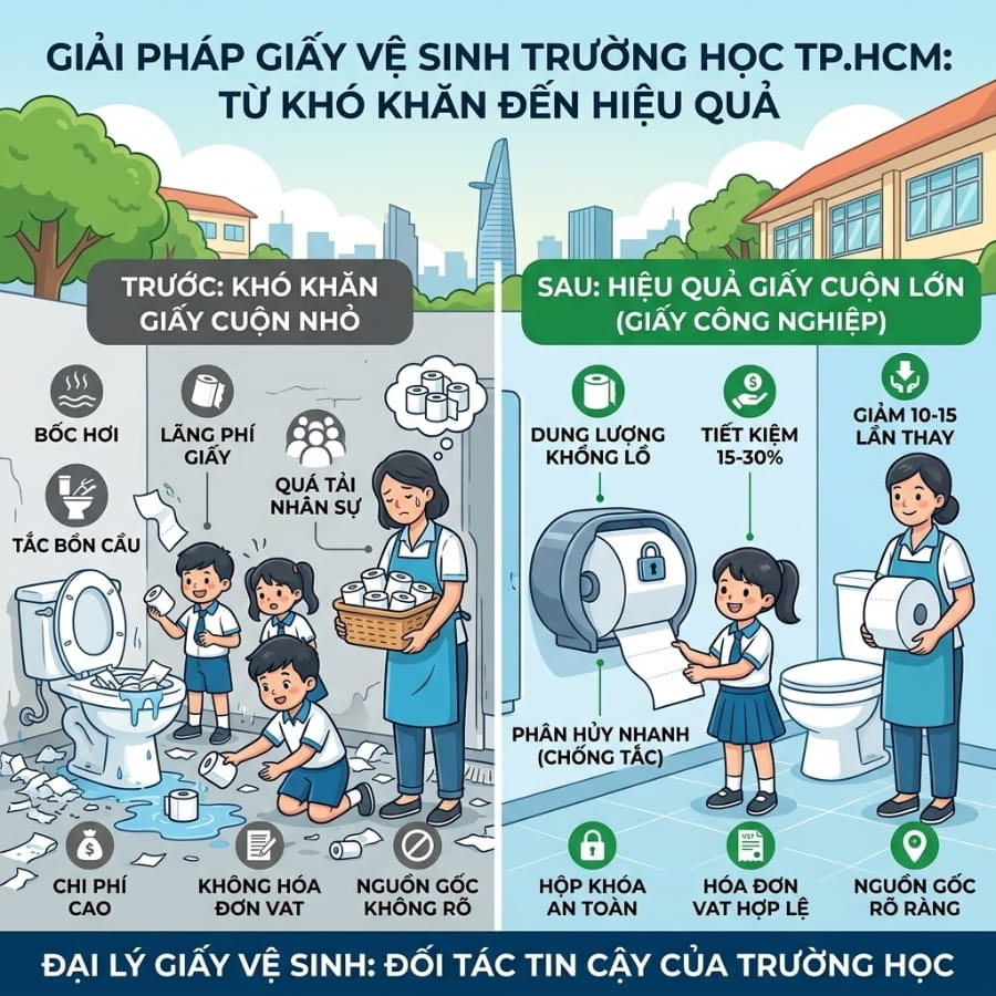 Quản lý cơ sở vật chất cho một hệ thống trường học tại TP.HCM chưa bao giờ là nhiệm vụ dễ dàng, đặc biệt là bài toán vật tư tiêu hao như giấy vệ sinh. Hàng tháng, nhà trường phải đối mặt với ngân sách đội lên chóng mặt vì học sinh sử dụng lãng phí, hay những hóa đơn thông tắc bồn cầu đắt đỏ do các em làm rớt lõi giấy vào bồn cầu. Nguy hiểm hơn, những loại giấy vệ sinh trôi nổi, ngậm đầy hóa chất tẩy trắng đang âm thầm đe dọa làn da nhạy cảm và hệ hô hấp của trẻ nhỏ. Đã đến lúc các nhà quản lý giáo dục cần một cuộc “cách mạng” trong việc lựa chọn nhà cung cấp. Nếu bạn đang tìm kiếm một đại lý giấy vệ sinh trường học TPHCM có khả năng cung cấp giải pháp toàn diện – vừa an toàn y tế, vừa cắt giảm triệt để chi phí vận hành – thì bài viết này chính là chiếc chìa khóa dành cho bạn.