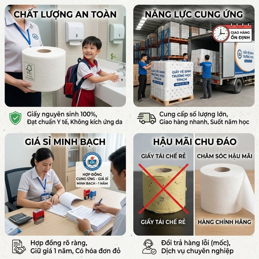 Bên cạnh chất lượng, năng lực cung ứng của đại lý là yếu tố sống còn để đảm bảo hoạt động của nhà trường không bị gián đoạn. Một đại lý giấy vệ sinh trường học TPHCM uy tín phải là đơn vị có năng lực cung ứng số lượng lớn, giao hàng nhanh chóng và ổn định xuyên suốt năm học. Tốt nhất, nhà trường nên làm việc với đơn vị có nhà máy sản xuất trực tiếp, không qua trung gian – chủ động về chất lượng, giá thành và tiến độ giao hàng.