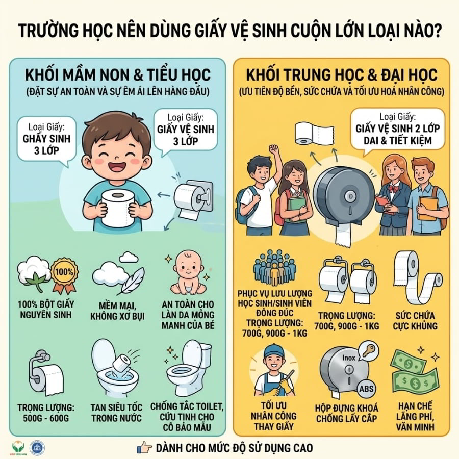 Đối với cấp học mầm non và tiểu học, tiêu chuẩn an toàn và sự êm ái luôn phải đặt lên hàng đầu. Làn da của các bé ở độ tuổi này rất mỏng manh, dễ bị hăm đỏ hay dị ứng nếu tiếp xúc với giấy khô ráp, nhiều xơ bụi. Do đó, các trường mầm non và tiểu học nên tuyệt đối ưu tiên dòng giấy vệ sinh 3 lớp, được làm từ 100% bột giấy nguyên sinh tinh khiết.