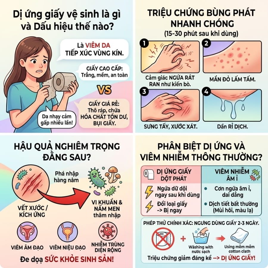 Việc nhận diện sớm chứng dị ứng này không chỉ giúp bạn thoát khỏi những cơn ngứa dai dẳng mà còn ngăn chặn nguy cơ tiến triển thành viêm nhiễm phụ khoa mãn tính. Rất nhiều người dùng đang nhầm lẫn giữa dị ứng hóa chất trong giấy vệ sinh với các căn bệnh lây truyền qua đường tình dục hay nấm mốc, dẫn đến việc điều trị sai cách, tốn kém và mệt mỏi kéo dài.
