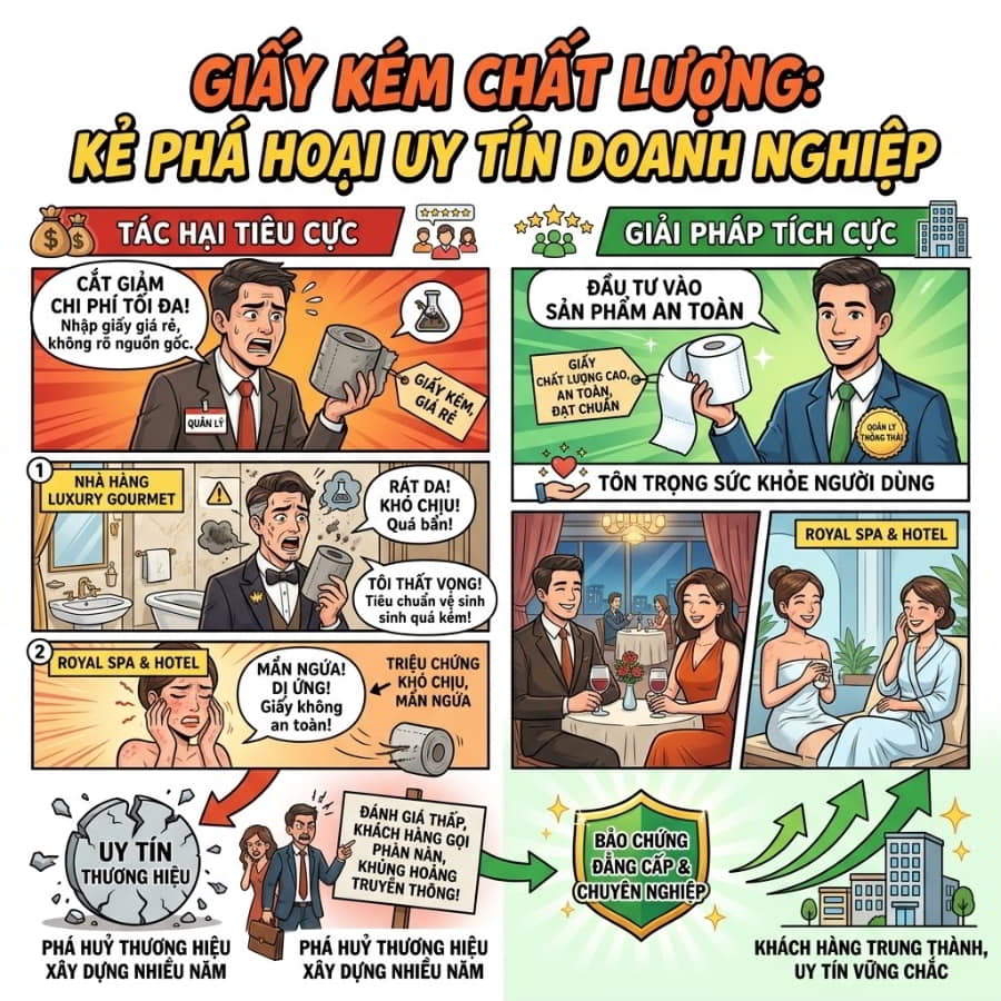 Hãy tưởng tượng một khách hàng VIP đang dùng bữa tại một nhà hàng sang trọng, nhưng khi bước vào nhà vệ sinh, họ phải đối mặt với một cuộn giấy thô ráp, tối màu, đầy bụi và có mùi hắc hóa chất. Cảm giác khó chịu, rát da sau khi sử dụng sẽ ngay lập tức biến thành sự thất vọng và tức giận. Họ sẽ đánh giá thấp tiêu chuẩn vệ sinh của cả hệ thống. Tương tự, nếu bạn đang quản lý mua giấy vệ sinh cho khách sạn hoặc giấy vệ sinh cho nhà hàng, việc khách hàng phàn nàn về triệu chứng mẩn ngứa do giấy vệ sinh là một cuộc khủng hoảng truyền thông thực sự. Việc đầu tư vào các sản phẩm giấy vệ sinh giá sỉ đạt chuẩn, an toàn không chỉ là sự tôn trọng đối với sức khỏe người dùng, mà còn là bảo chứng vững chắc cho đẳng cấp và sự chuyên nghiệp của doanh nghiệp bạn.