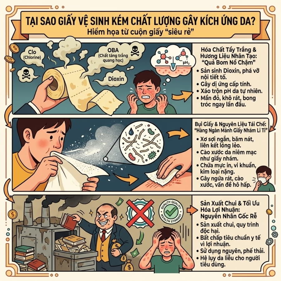Có một sự thật cay đắng: không phải loại giấy vệ sinh nào cũng được sinh ra để nâng niu làn da của bạn. Giấy vệ sinh kém chất lượng có thể gây bụi giấy, mùi khó chịu, ảnh hưởng trực tiếp đến sức khỏe người dùng. Để tối ưu hóa lợi nhuận, nhiều cơ sở sản xuất chui đã bất chấp các tiêu chuẩn y tế, sử dụng nguồn nguyên liệu phế thải và quy trình xử lý độc hại. Hệ quả là người tiêu dùng phải gánh chịu những hệ lụy nặng nề về da liễu. Vậy chính xác thì yếu tố nào trong cuộn giấy “siêu rẻ” ấy đã phản bội lại cơ thể bạn?