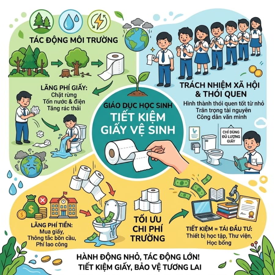 Mỗi cuộn giấy trắng muốt đều được đánh đổi bằng lượng lớn gỗ rừng, nước sạch và năng lượng điện. Khi học sinh lạm dụng giấy vệ sinh để lau tay, lau giày, hoặc vò nát để chơi đùa, các em đang gián tiếp làm tăng lượng rác thải rắn và thúc đẩy quá trình chặt phá rừng. Việc chỉ cho các em thấy chuỗi cung ứng của một tờ giấy—từ một cái cây xanh bị đốn hạ đến khi thành rác thải—là cách tác động mạnh mẽ nhất vào nhận thức. Giáo dục học sinh tiết kiệm giấy chính là bài học vỡ lòng về lối sống xanh, giúp các em hiểu rằng hành động nhỏ (rút ít đi một tờ giấy) mang lại tác động lớn (cứu sống một cái cây).