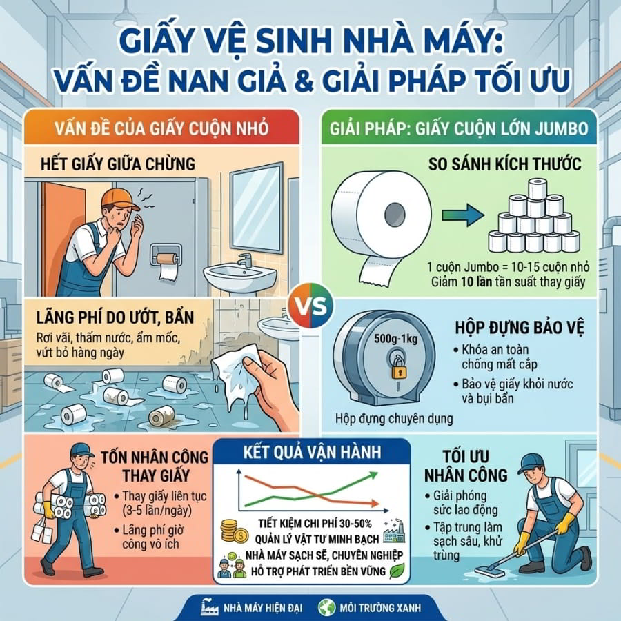 Quản lý một nhà máy với hàng trăm, hàng ngàn công nhân viên chưa bao giờ là bài toán dễ dàng, đặc biệt là ở những chi tiết tưởng chừng như nhỏ nhặt nhất: giấy vệ sinh. Hầu hết các nhà máy khi mới vận hành đều mắc phải một “thiên kiến nhận thức” phổ biến là mua giấy cuộn nhỏ truyền thống cho rẻ. Tuy nhiên, sự lựa chọn này nhanh chóng bộc lộ những điểm yếu chết người trong một môi trường có mật độ sử dụng quá tải.
