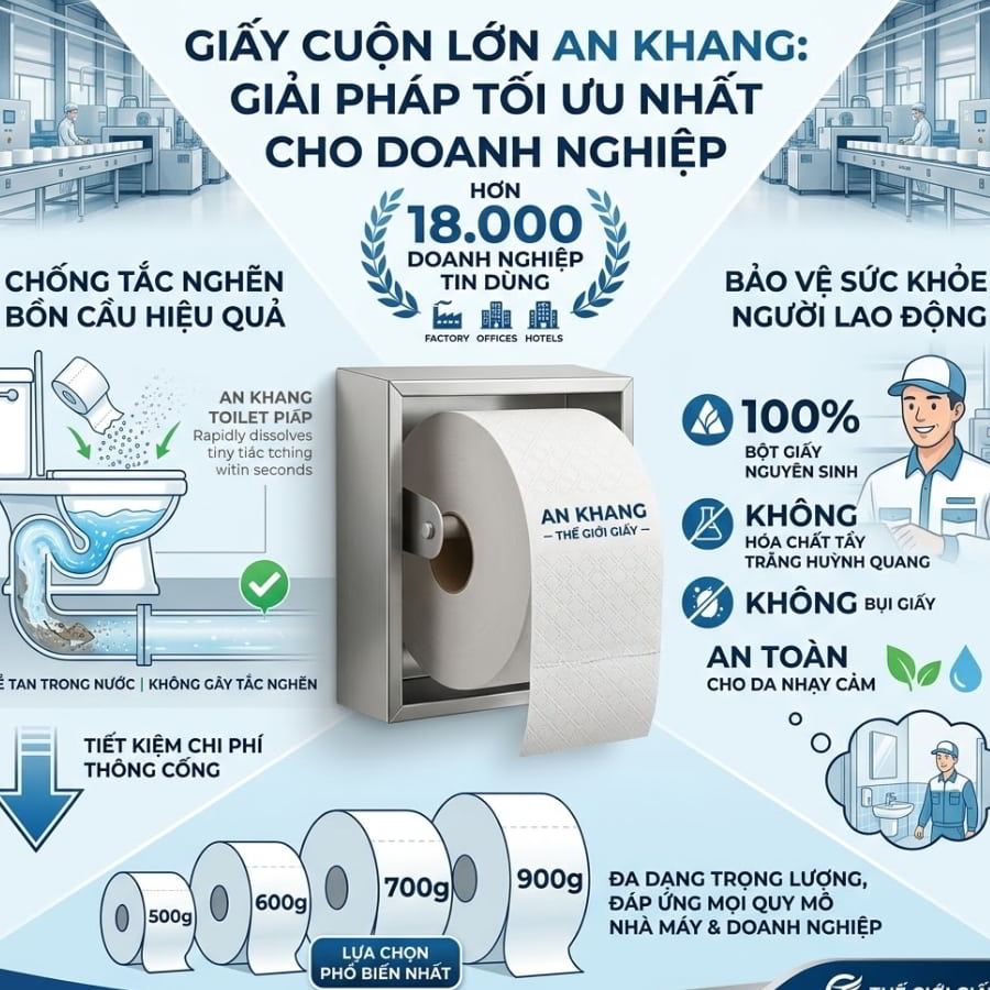 Với những phân tích thực tế trên, hy vọng việc lựa chọn giấy vệ sinh cuộn lớn An Khang cho nhà máy sẽ trở nên kỹ lưỡng và dễ dàng hơn, giúp các doanh nghiệp tiết kiệm tối đa chi phí vận hành, chống tắc nghẽn và đảm bảo một môi trường làm việc sạch sẽ, chuyên nghiệp lâu dài.