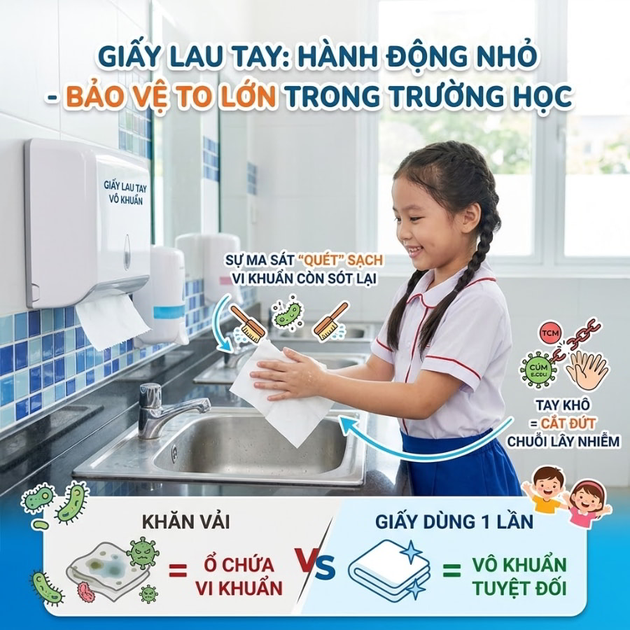 Sự ma sát cơ học nhẹ nhàng của giấy lau tay không chỉ thấm hút nước mà còn “quét” sạch những mầm bệnh cứng đầu còn sót lại trên lớp biểu bì. Khi tay khô ráo, môi trường sinh sôi lý tưởng của vi rút tay chân miệng, vi khuẩn E.coli hay vi rút cúm hoàn toàn bị triệt tiêu. Đây là một bước bảo vệ chủ động, cắt đứt hoàn toàn chuỗi lây nhiễm tại lớp học, giúp phụ huynh an tâm tuyệt đối khi gửi gắm con em mình. Hành động nhỏ từ việc dùng giấy lau tay mang lại giá trị to lớn cho bức tường phòng dịch của toàn trường.