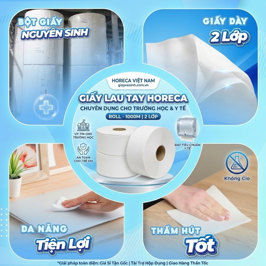 Horeca Việt Nam (https://giayvesinh.com.vn/) tự hào là một trong những đối tác chiến lược hàng đầu trong việc cung cấp vật tư tiêu hao ngành giấy cho hàng loạt hệ thống trường học, bệnh viện và tòa nhà trên toàn quốc. Thấu hiểu tiêu chuẩn khắt khe của môi trường giáo dục, toàn bộ các dòng khăn giấy lau tay do Horeca phân phối đều được tuyển chọn nghiêm ngặt, đảm bảo sản xuất từ 100% bột giấy nguyên sinh tinh khiết.