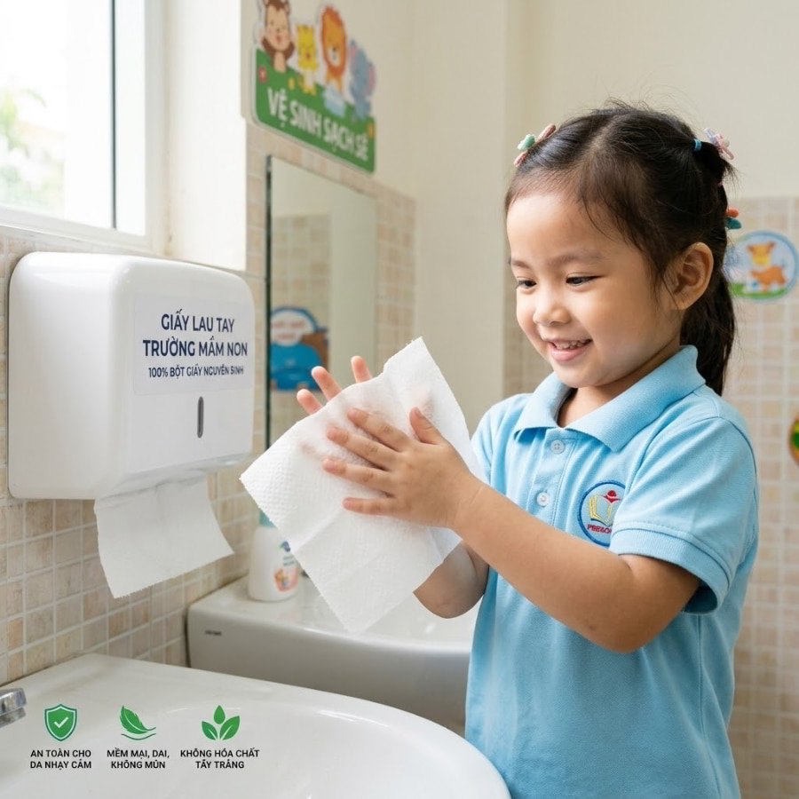 Để đảm bảo an toàn tuyệt đối, sản phẩm dành cho trường học, bệnh viện, cơ sở y tế: Đòi hỏi sản phẩm vừa sạch sẽ, an toàn với da, lại tiết kiệm chi phí tiêu hao. Các dòng giấy lau tay tiêu chuẩn phải đảm bảo tiêu chí không mùi, không gây kích ứng da, phù hợp cho trẻ em, người bệnh. Việc giữ nguyên độ trắng tự nhiên không chỉ thân thiện với môi trường mà còn là tấm khiên vững chắc bảo vệ làn da non nớt của các em học sinh mỗi ngày.