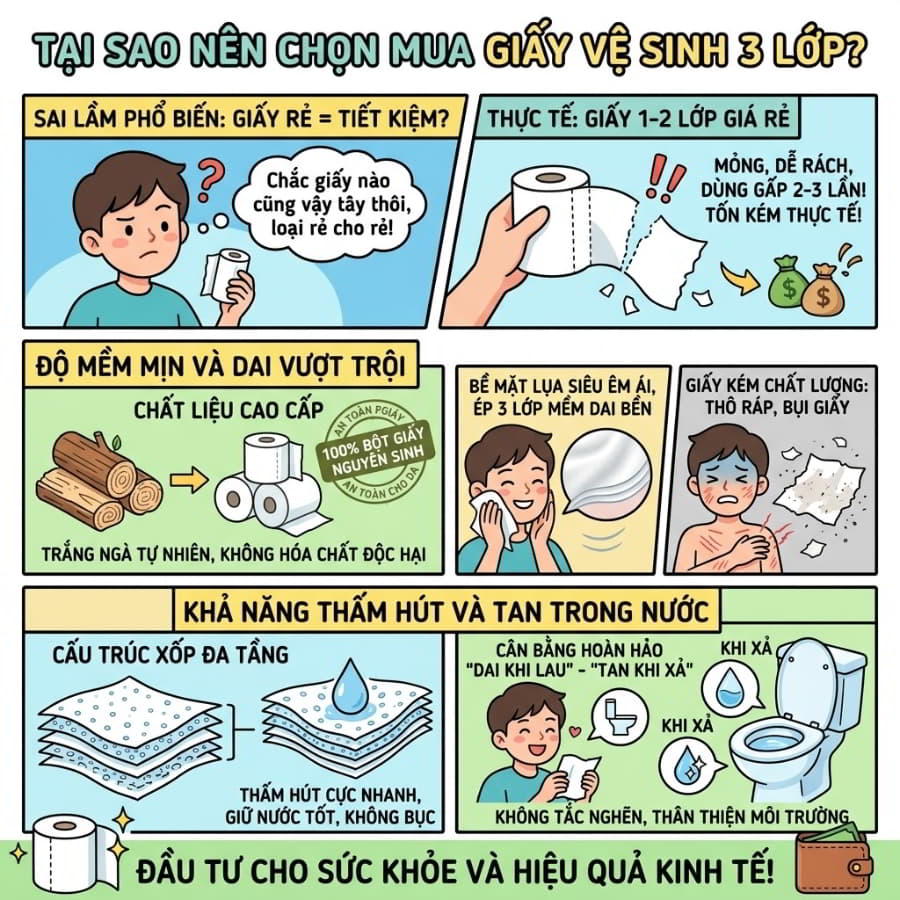 Nhiều người mang tâm lý “giấy nào chẳng giống nhau, mua loại rẻ 1-2 lớp cho tiết kiệm”. Đây là một sai lầm phổ biến. Giấy giá rẻ thường mỏng, dễ rách, khiến bạn phải dùng lượng gấp đôi, gấp ba cho mỗi lần sử dụng. Việc đầu tư vào giấy 3 lớp mang lại những giá trị vượt trội cả về trải nghiệm lẫn hiệu quả kinh tế.