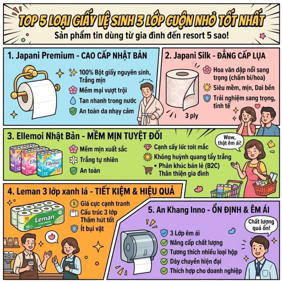 Bạn đã bao giờ trải qua cảm giác bực bội khi bước vào một không gian nhà vệ sinh sang trọng, nhưng lại phải sử dụng cuộn giấy mỏng dính, thô ráp và mủn ngay khi vừa chạm nước? Dù ở nhà hay tại các cơ sở kinh doanh, một cuộn giấy vệ sinh kém chất lượng có thể phá hỏng toàn bộ trải nghiệm sống và làm giảm uy tín của thương hiệu. Năm 2026, tiêu chuẩn về an toàn và tiện nghi đã thay đổi. Người dùng không chỉ cần giấy để lau, họ cần sự êm ái tuyệt đối. Đó là lý do từ khóa “giấy vệ sinh 3 lớp cuộn nhỏ” đang trở thành tiêu chuẩn vàng mới. Trong bài viết này, chúng tôi sẽ phá vỡ lầm tưởng “giấy càng dày càng dễ tắc bồn cầu” và điểm mặt top 5 sản phẩm xuất sắc nhất giúp bạn nâng tầm chất lượng không gian vệ sinh.