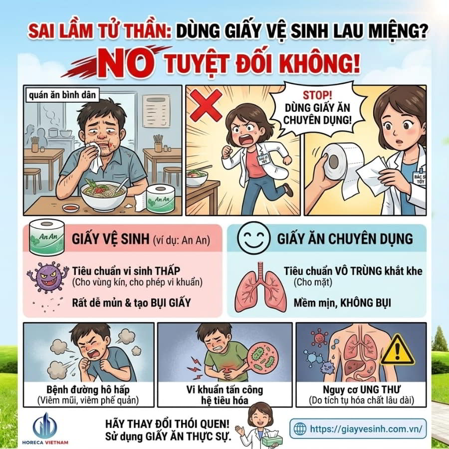 Câu trả lời ngắn gọn và đanh thép nhất là: TUYỆT ĐỐI KHÔNG! Đây là một trong những thói quen sai lầm và nguy hiểm nhất của người Việt (chiếm tới 70% ở các quán ăn bình dân). Giấy vệ sinh và giấy ăn (facial tissue) được sản xuất theo hai tiêu chuẩn chất lượng và an toàn hoàn toàn khác biệt.
