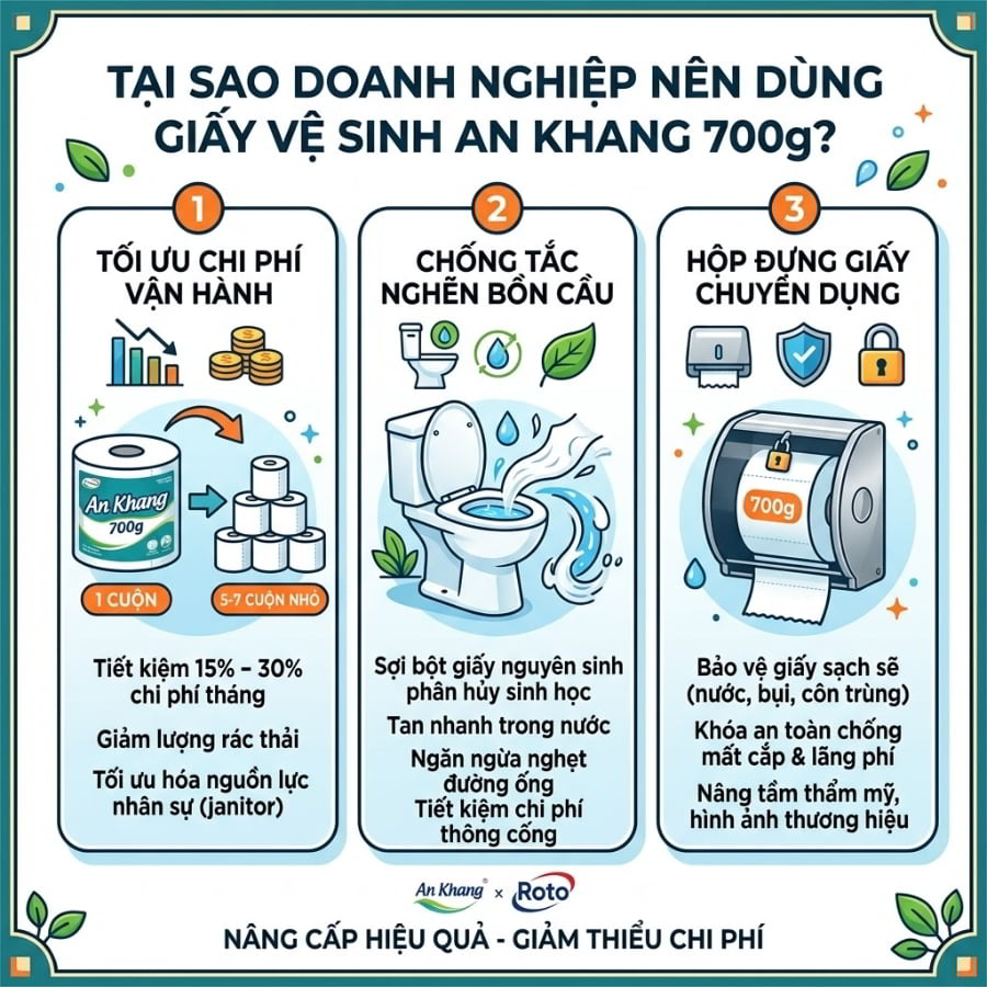 Trong quản trị doanh nghiệp hiện đại, mọi chi phí vật tư tiêu hao đều cần được đo lường bằng Tỷ suất hoàn vốn (ROI) và hiệu năng vận hành. Đã qua rồi cái thời mua giấy vệ sinh cuộn nhỏ giá rẻ để rồi phải trả giá bằng chi phí nhân công và phí thông tắc bồn cầu khổng lồ. Sự chuyển dịch sang sử dụng giấy vệ sinh cuộn lớn An Khang 700g mang lại 3 lợi thế chiến lược không thể phủ nhận.