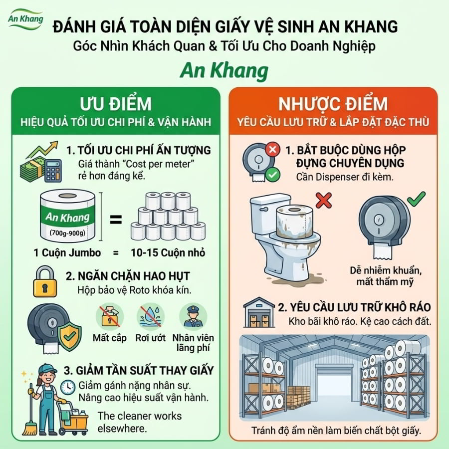 Nhược điểm cần lưu ý: Khuyết điểm lớn nhất của giấy vệ sinh cuộn lớn An Khang là bắt buộc phải có hộp đựng thiết bị chuyên dụng (dispenser) đi kèm. Nếu bạn cố tình đặt cuộn giấy 1kg trên bệ sứ thông thường, giấy sẽ rất dễ nhiễm khuẩn, thấm nước và gây mất thẩm mỹ trầm trọng. Ngoài ra, sản phẩm có trọng lượng lớn nên yêu cầu kho bãi lưu trữ phải khô ráo, có kệ cao cách đất nhằm tránh tình trạng độ ẩm nền làm biến chất bột giấy tự nhiên.