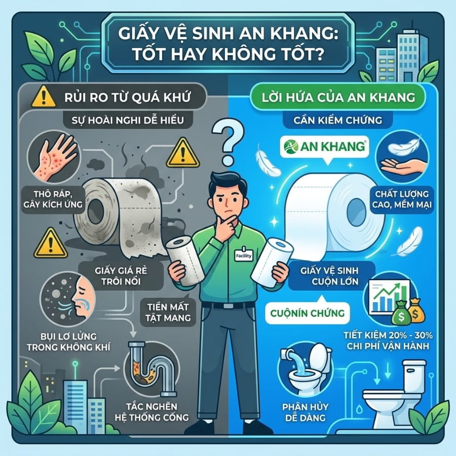 Khác với việc mua một sản phẩm dùng cá nhân, việc chọn vật tư tiêu hao cho khối doanh nghiệp (B2B) mang rủi ro lớn hơn rất nhiều. Hàng ngàn câu hỏi giấy vệ sinh An Khang có tốt không được đặt ra trên các diễn đàn quản trị cơ sở vật chất, bắt nguồn từ chính nỗi sợ “tiền mất tật mang”.