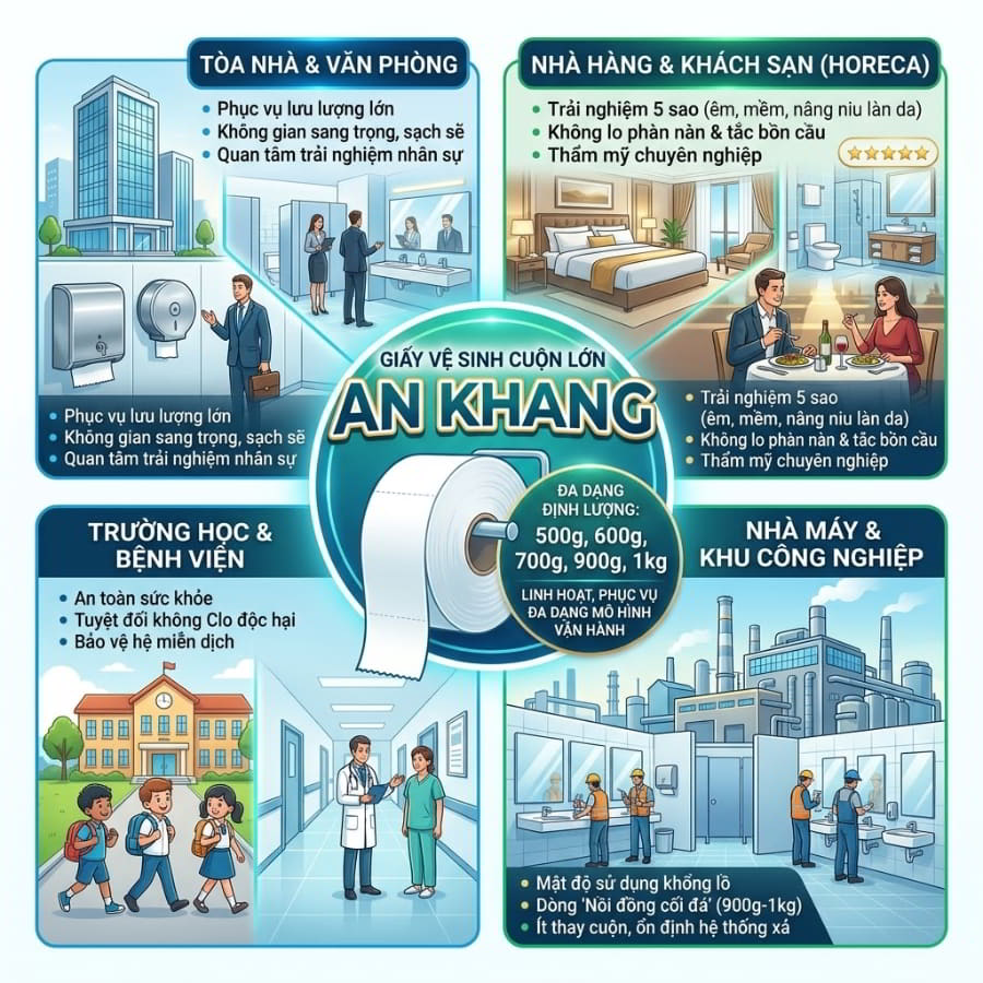 Trong khi đó, khu công nghiệp cần một giải pháp “nồi đồng cối đá” để đáp ứng mật độ xả tải khổng lồ vào mỗi giờ giao ca. Ứng dụng giấy vệ sinh cho nhà máy dòng An Khang 900g hay 1kg là nước đi cực kỳ chiến lược, triệt tiêu bài toán liên tục thay cuộn giấy, đồng thời duy trì sự ổn định của hệ thống ống xả công nghiệp tại các phân xưởng.