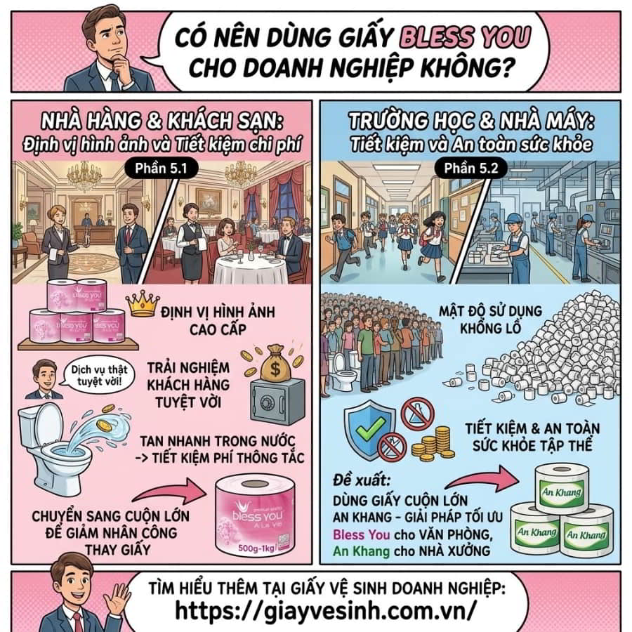 Thông qua những góc nhìn phân tích chuyên sâu về bài toán tối ưu chi phí và giá trị cốt lõi từ 100% bột giấy nguyên sinh của Bless You, hy vọng bạn đã có đủ cơ sở vững chắc để tự tin đưa ra quyết định nâng cấp hệ thống vật tư tiêu hao. Sự chuyển đổi mang tính chiến lược này không chỉ giúp chủ doanh nghiệp, ban quản lý nhà hàng, khách sạn, trường học hay tòa nhà kiến tạo một trải nghiệm vệ sinh đẳng cấp; bảo vệ tối đa sức khỏe làn da người dùng; triệt tiêu hoàn toàn rủi ro tắc nghẽn bồn cầu, mà còn là đòn bẩy xuất sắc giúp cắt giảm tới 30% ngân sách vận hành dài hạn.