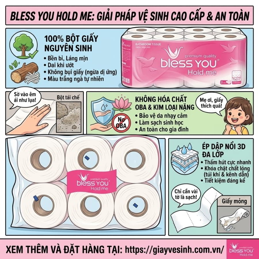 Bạn có bao giờ cảm thấy khó chịu vì những cuộn giấy vệ sinh thô ráp, để lại đầy bụi trắng mỗi khi xé, hay tệ hơn là gây mẩn đỏ cho làn da nhạy cảm của các thành viên trong gia đình? Rất nhiều người tiêu dùng đang mắc kẹt trong “cái bẫy” của những sản phẩm giá rẻ, pha tạp chất và chứa đầy hóa chất tẩy trắng độc hại. Những hệ lụy không chỉ dừng lại ở cảm giác khó chịu nhất thời mà còn là nguy cơ về da liễu và tình trạng tắc nghẽn bồn cầu thường xuyên. Đã đến lúc bạn cần một giải pháp nâng tầm chất lượng sống. Và giấy vệ sinh Bless You Hold Me chính là câu trả lời hoàn hảo – một biểu tượng của sự tinh khiết, độ mềm mịn tuyệt đối và sự an tâm trọn vẹn cho sức khỏe.
