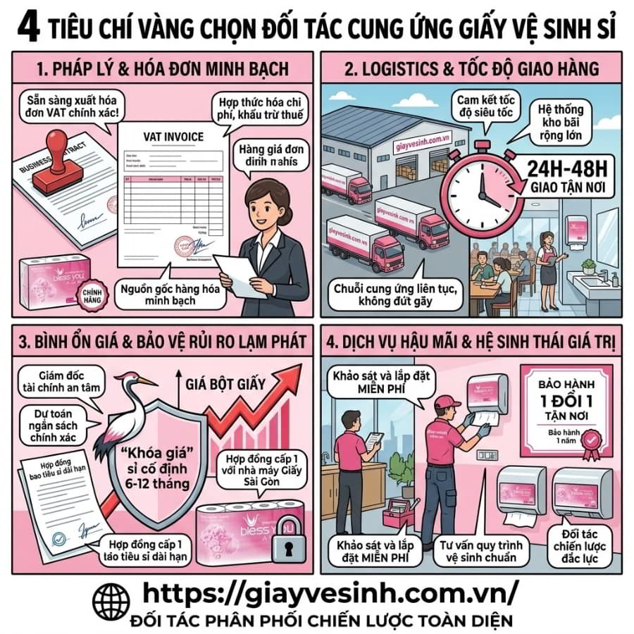 6. Những tiêu chí cốt lõi nào cần đánh giá chi tiết khi lựa chọn nhà phân phối giấy vệ sinh số lượng lớn?