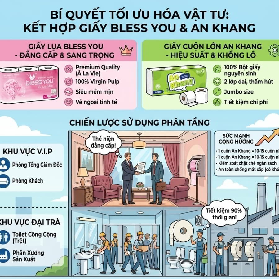 Việc quản lý vật tư cho những khu vực có lưu lượng người qua lại khổng lồ (High-traffic areas) đòi hỏi những nhà quản lý (Facility Managers) phải có một chiến lược cung ứng vô cùng thông minh. Việc phân bổ nguồn lực dựa trên nhu cầu thực tế của từng phân khu chính là chìa khóa. Mặc dù Bless You là một cực phẩm về chất lượng, nhưng việc sử dụng dòng giấy cuộn nhỏ này cho mọi ngóc ngách đôi khi không mang lại hiệu suất vận hành (Operation Efficiency) tốt nhất. Đây chính là lúc bạn cần áp dụng chiến thuật “Phân tầng sử dụng không gian”.