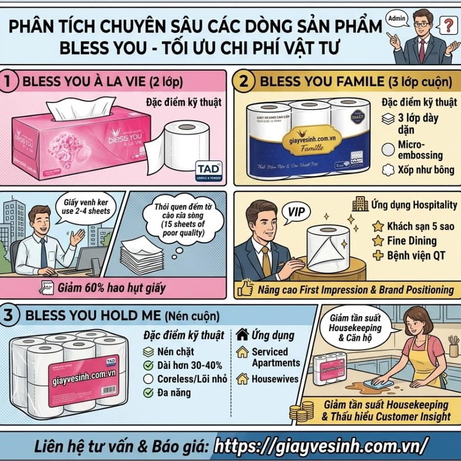 Không có một loại giấy vệ sinh nào là “tốt nhất” cho mọi hoàn cảnh. Việc quản trị vật tư thông minh nằm ở chỗ bạn chọn đúng sản phẩm cho đúng mục đích sử dụng. Nhằm đáp ứng mọi nhu cầu từ dân dụng đến công nghiệp, Giấy Sài Gòn đã phát triển 3 dòng sản phẩm chủ lực mang thương hiệu Bless You, mỗi dòng mang một sứ mệnh kinh tế học riêng biệt.