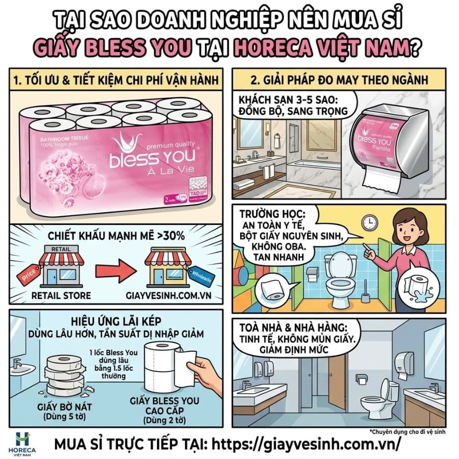 Horeca Việt Nam – hệ thống phân phối thiết bị và vật tư tiêu hao hàng đầu – sẽ bóc tách mọi góc nhìn, mọi bí mật trong ngành công nghiệp giấy lụa. Chúng tôi không chỉ phân tích cho bạn hiểu về cấu trúc phân tử của bột giấy nguyên sinh, độ an toàn da liễu hay trải nghiệm người dùng, mà còn mang đến một Bản kế hoạch tối ưu hóa tài chính B2B thực chiến. Bạn sẽ khám phá ra công thức tính toán lượng giấy tiêu thụ, lý do tại sao việc chuyển đổi sang một thương hiệu uy tín lại giúp giảm thiểu 50% rác thải xả ra môi trường, và quan trọng nhất: Bí quyết để nhận mức chiết khấu khủng lên tới hơn 30% khi mua sỉ giấy Bless You, giúp giữ lại hàng chục triệu đồng cho dòng tiền của doanh nghiệp mỗi năm.
