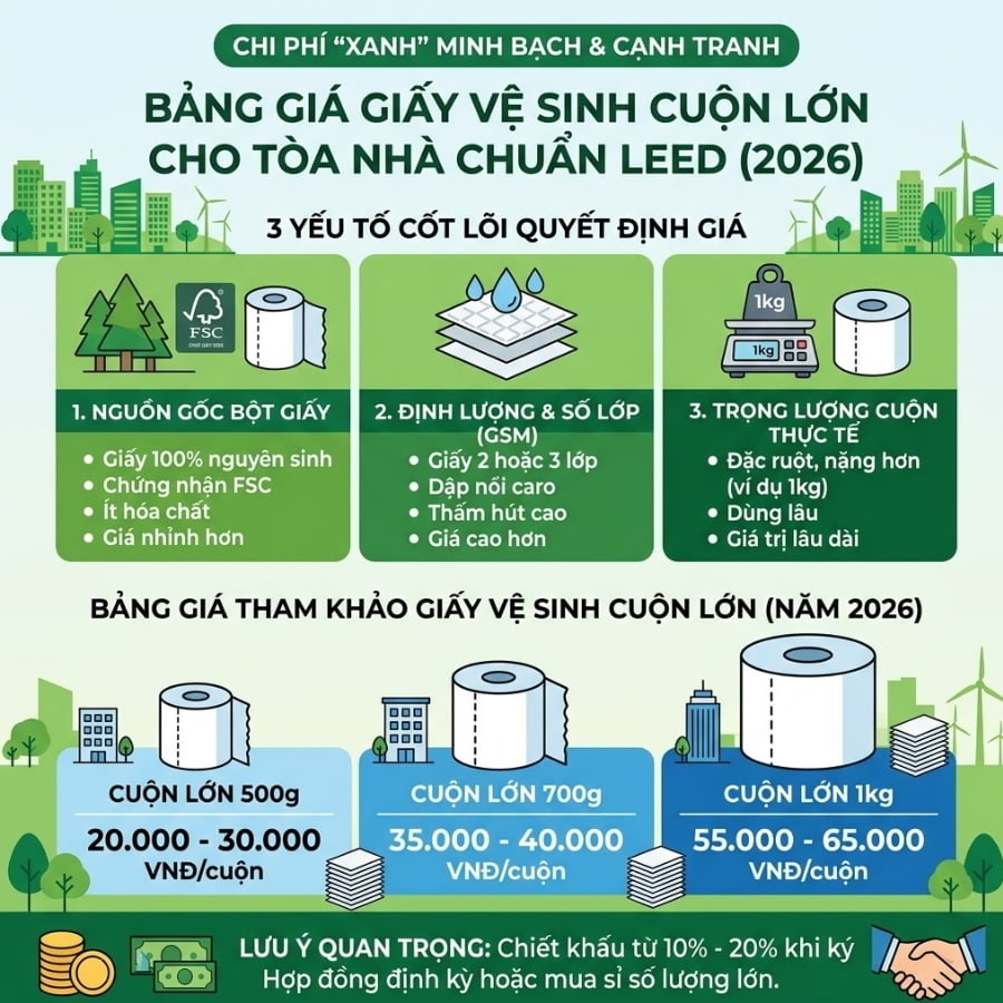 Bảng giá giấy vệ sinh cuộn lớn cho tòa nhà chuẩn LEED năm 2026 là bao nhiêu?