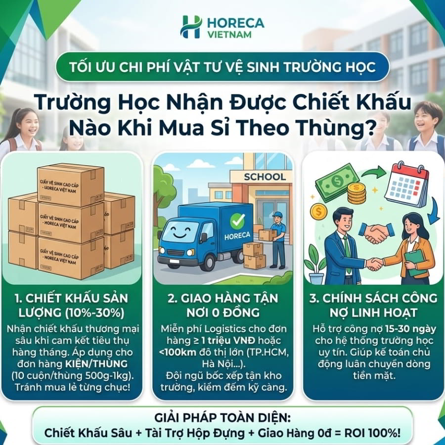 Sự cố tràn bồn cầu, giấy ướt vứt bừa bãi hay những cơn dị ứng ngứa ngáy của trẻ nhỏ hoàn toàn có thể được ngăn chặn vĩnh viễn chỉ bằng một quyết định thay đổi tư duy thu mua vật tư. 👉 Đã đến lúc chấm dứt chuỗi ngày lãng phí ngân sách tiêu hao! Hãy liên hệ ngay với Horeca Việt Nam (https://giayvesinh.com.vn/) qua Hotline ngay hôm nay để nhận được sự tư vấn kỹ thuật tận tâm, bộ mẫu thử chất lượng cao miễn phí và siêu ưu đãi tài trợ hộp đựng giấy cao cấp dành riêng cho khối trường học trong tháng này. Horeca Việt Nam – Đồng hành cùng nền giáo dục Việt Nam kiến tạo không gian học đường xanh, sạch và phát triển bền vững!