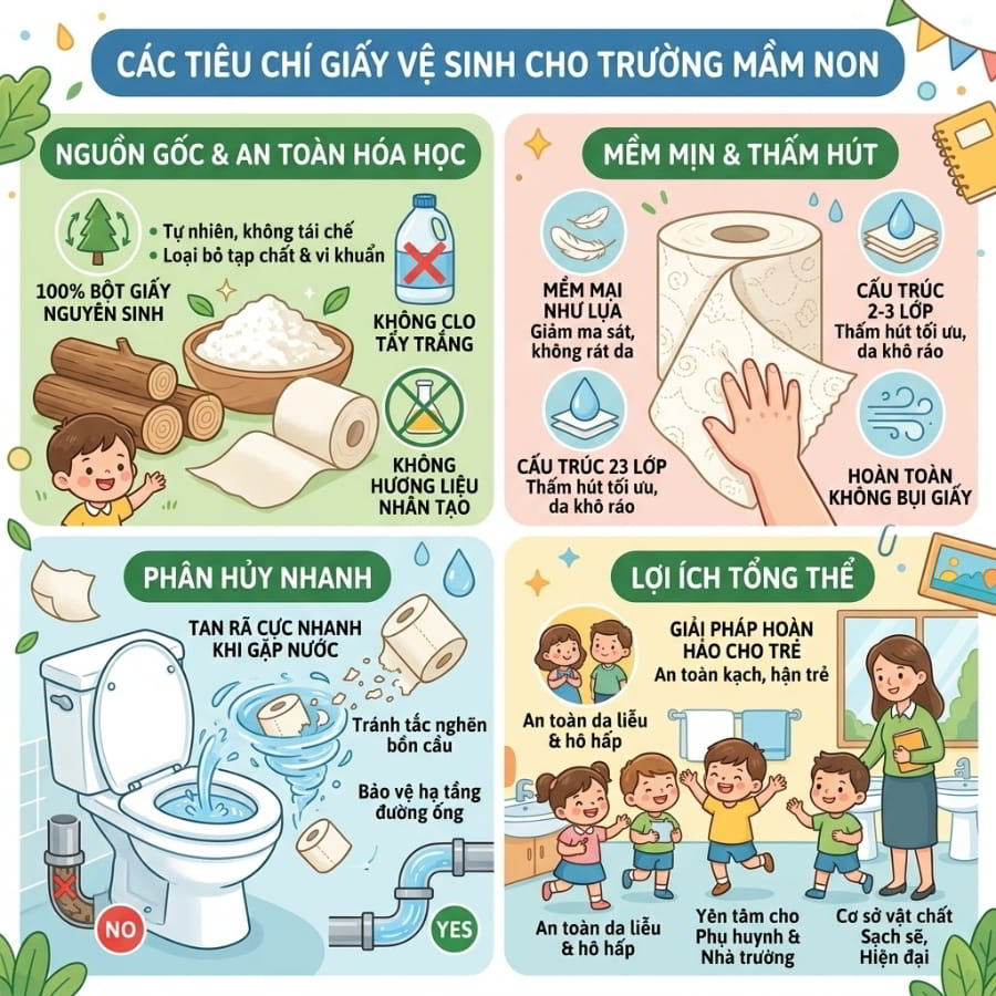 Với những tiêu chí trên, hy vọng việc lựa chọn giấy vệ sinh cho trường mầm non sẽ trở nên kỹ lưỡng hơn, giúp nhà trường đảm bảo an toàn tuyệt đối cho sức khỏe của trẻ, duy trì không gian sạch sẽ và tối ưu hiệu quả chi phí trong quá trình vận hành lâu dài.